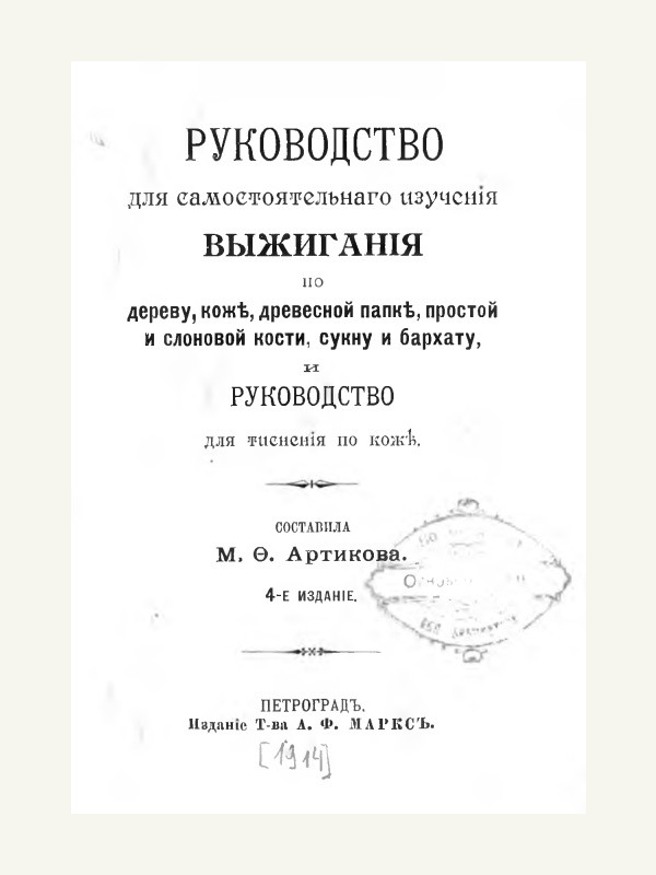 Руководство для самостоятельного изучения выжигания по дереву, коже, древесной папке, простой и слоновой кости, сукну и бархату, и руководство для тиснения по коже.