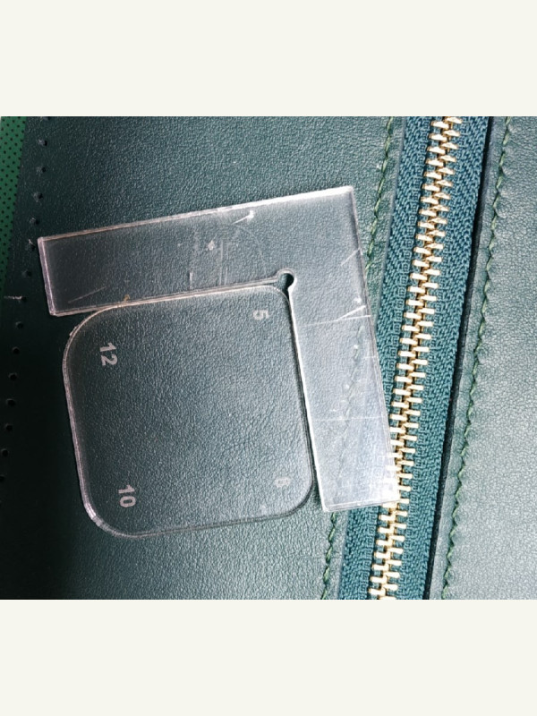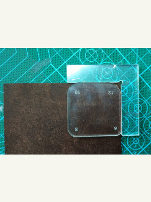 1. Первая - радиусная с угольником для точного позиционирования. Предназначена для скругления изначально прямоугольных деталей. Угольник должен быть изготовлен из более толстого материала, чем «квадратики» с радиусами. Для работы нужно упереться угольником к прямоугольной детали внутренним углом, нужным радиусом приложиться к угольнику, зафиксировать, прижав пальцами посильнее, убрать угольник, очертить шилом радиус, отрезать.