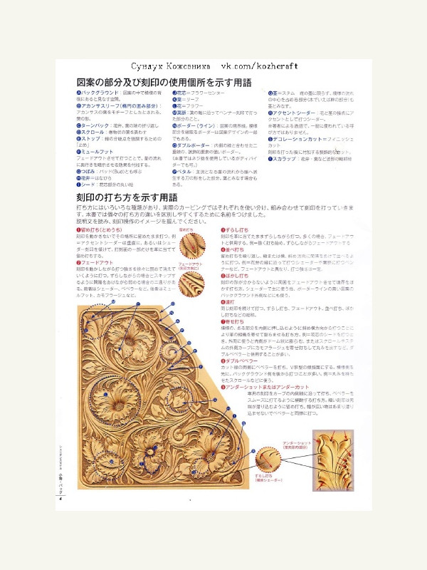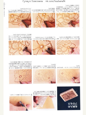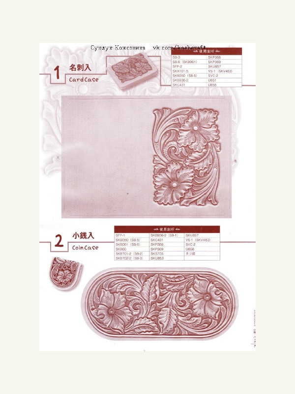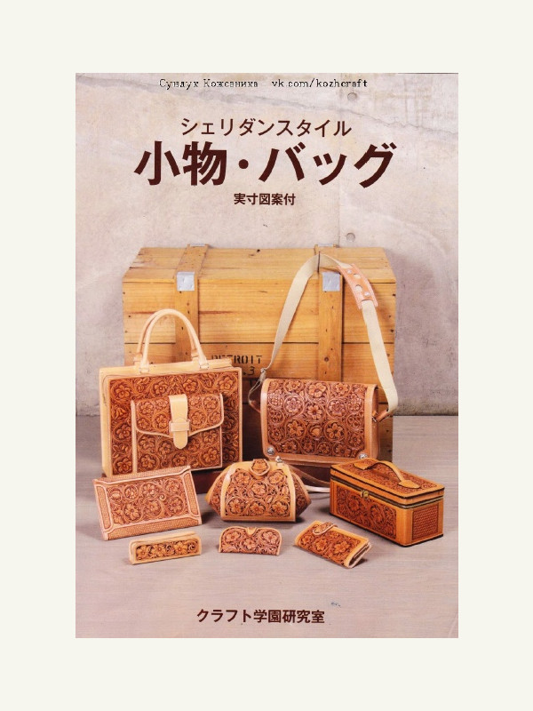 Новая книжка для кожевенных дел мастеров - Sheridan Style Design bags cases. Тиснение растишки в стиле "Шеридан". В книге показано по шагам как делать тиснение. Приведены примеры рисунков для тиснения, рассмотрены виды штампов, которые используются в этой технике тиснения. Книга на японском языке, много фото, рисунков, 27 стр.