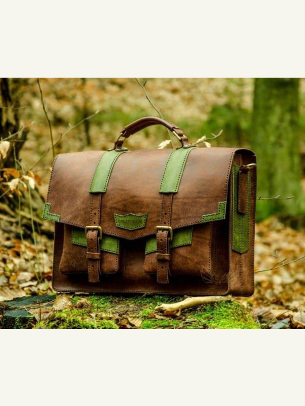 Глядя на картинку, портфель смотрится стильным и брутальным с зелеными лямками, но и с другой кожей он не потеряет свой вид. Думаем стоит попробовать сшить портфель с разной кожей, возможно и добавления своих элементов. Благодаря выкройки портфеля из кожи есть где разгуляться фантазии.