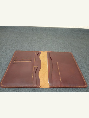 паспорт, отдел для стс, отдел для в/у, 6 дисконтных/банковских карт, ну и есть небольшой отдел для купюр сложенных пополам. Размер 147/105 в сложенном виде.