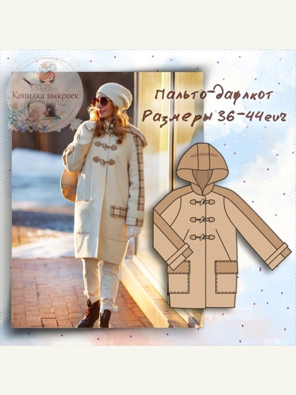Классическая модель английского женского пальто с капюшоном, рукавом реглан и застежкой “клык моржа”. Для пошива подойдут не сильно объемные пальтовые ткани – твид, сукно, драп и другие сопоставимые ткани по плотности.