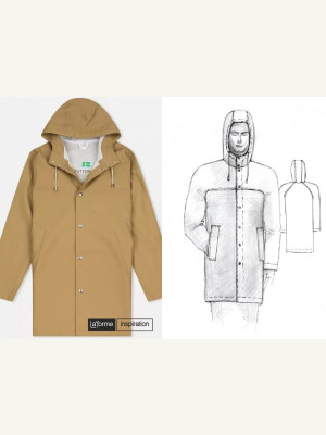 прямого силуэта, без подкладки, из плащевого материала. Перед с центральной бортовой застежкой на 8 курточных кнопок (или молнию длиной 80 см), с притачной подпланкой по борту, с боковыми прорезными карманами с листочкой. Спинка без среднего шва. Рукав одношовный, покроя реглан на спинке и реглан-кокетка на переде. Капюшон с центральной частью, с цельнокроенной стойкой, с обтачкой и кулисой в ней.