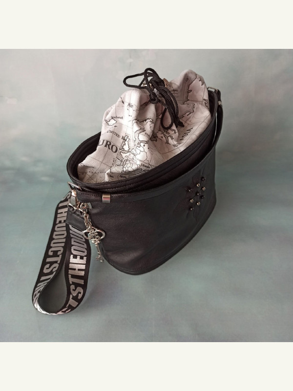 Сумка закрывается шнуром в кулиске, имеет короткую ручку и съемный ремень для носки через плечо, донышко овальной формы.