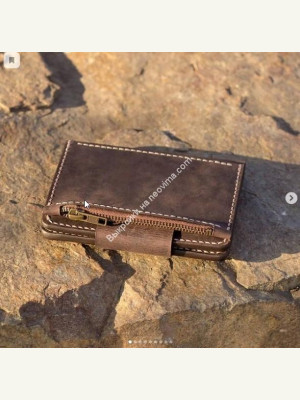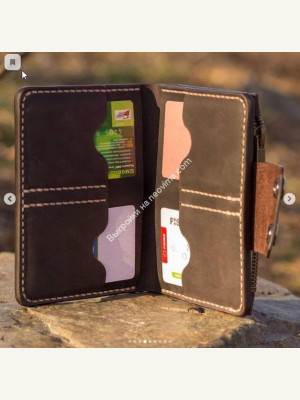 Имеет 1 большой карман размером 23*15см, два кармашка 10х15см, один карманчик на молнии 8*15см и 4 отдела для карт. Возможно изготовление в другом цвете, а также использовать для прошивки нить другого цвета.
