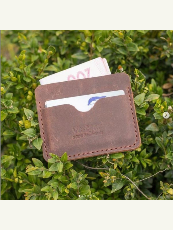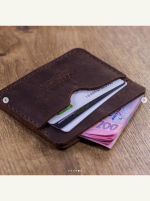 Мини-кошелек из кожи ручной работы. Одно отделение под деньги и одно под карточки. Нет никаких застежек, кнопочек, молний и прочего.