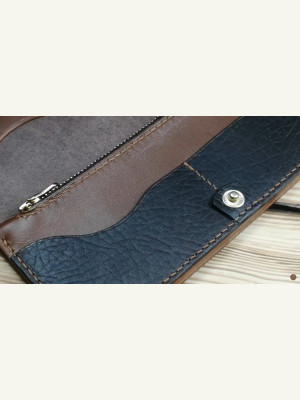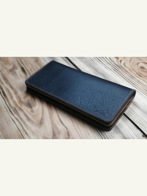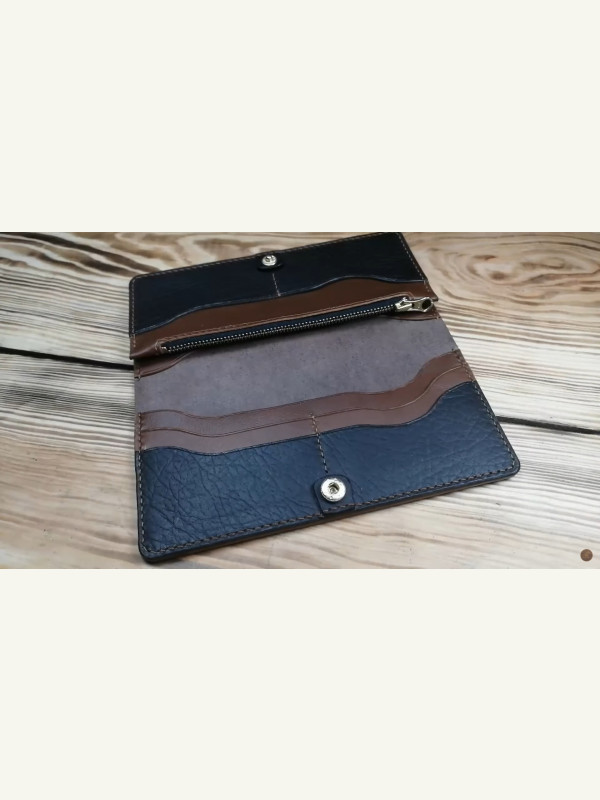 В готовом варианте 185 х 90мм. Максимальная ширина купюр 70 мм. Отделы под карты, два отдела для купюр и отдел для мелочи. Сделан из кожи растительного дубления в двух толщинах.