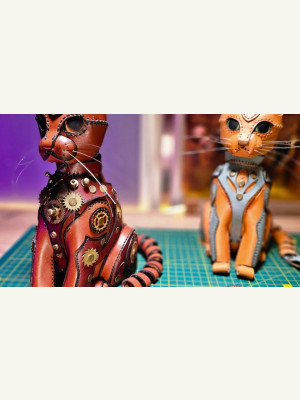 Яркая и необычная кожаная копилка в виде кошки, оформленная к тому же в силе стимпанк.