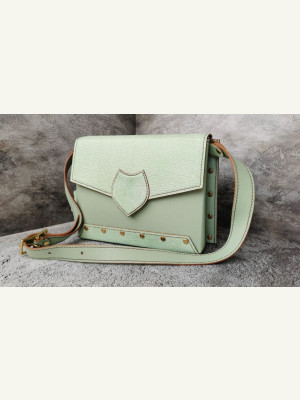 35 ременных винтов 10мм, высота ножки 4 мм, 2 карабин, застежка сумки, пряжка. Сумка жёсткой формы, дно и клапан дублируются кожкартоном не доходят до линий сгиба 2 мм с каждой стороны. Детали переда и спинки дублируются в центре до пунктира и по краям под винты. Подкладка из замши, все склеивается в одну деталь.