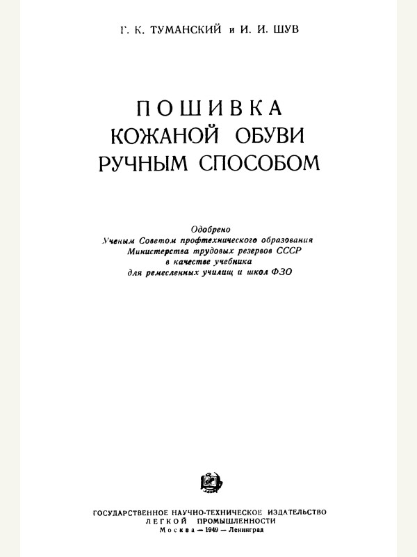 Книга. Пошивка кожаной обуви ручным способом - Туманский Г.К., Шув И.И., 1949г.
